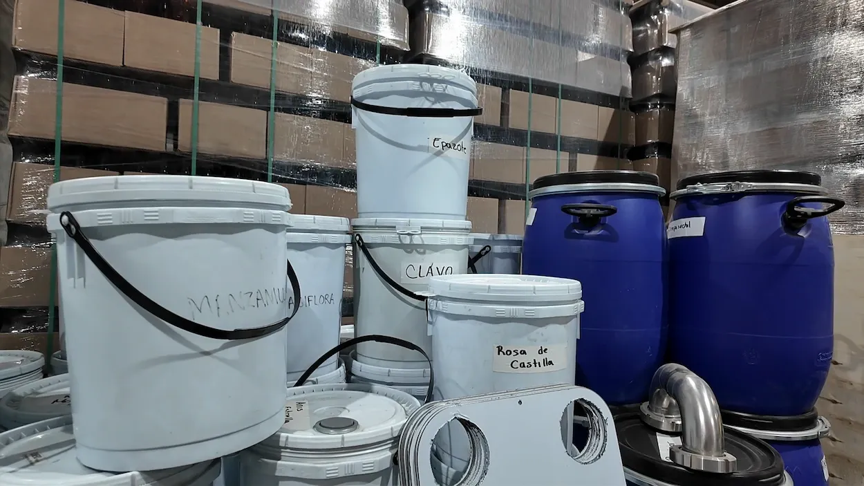 Los botánicos nos llegan en esas cobetas blancas, ahora pasamos a verlos. El jefe de producción con órdenes de Andrés Valverde hace la receta exacta y ya que tiene todos los elementos juntos en los azules eso lo pasa para acá para que se muela….